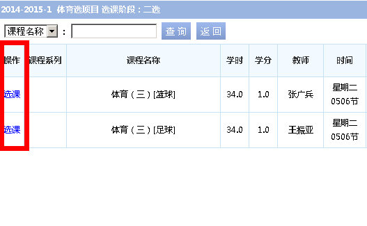 比如该同学上的是《体育三》的“篮球”项目(如下图),则鼠标点击“选课”项。此时右边的已选课程中会出现该条体育项目信息,一定要确认已选课程中有体育课。
